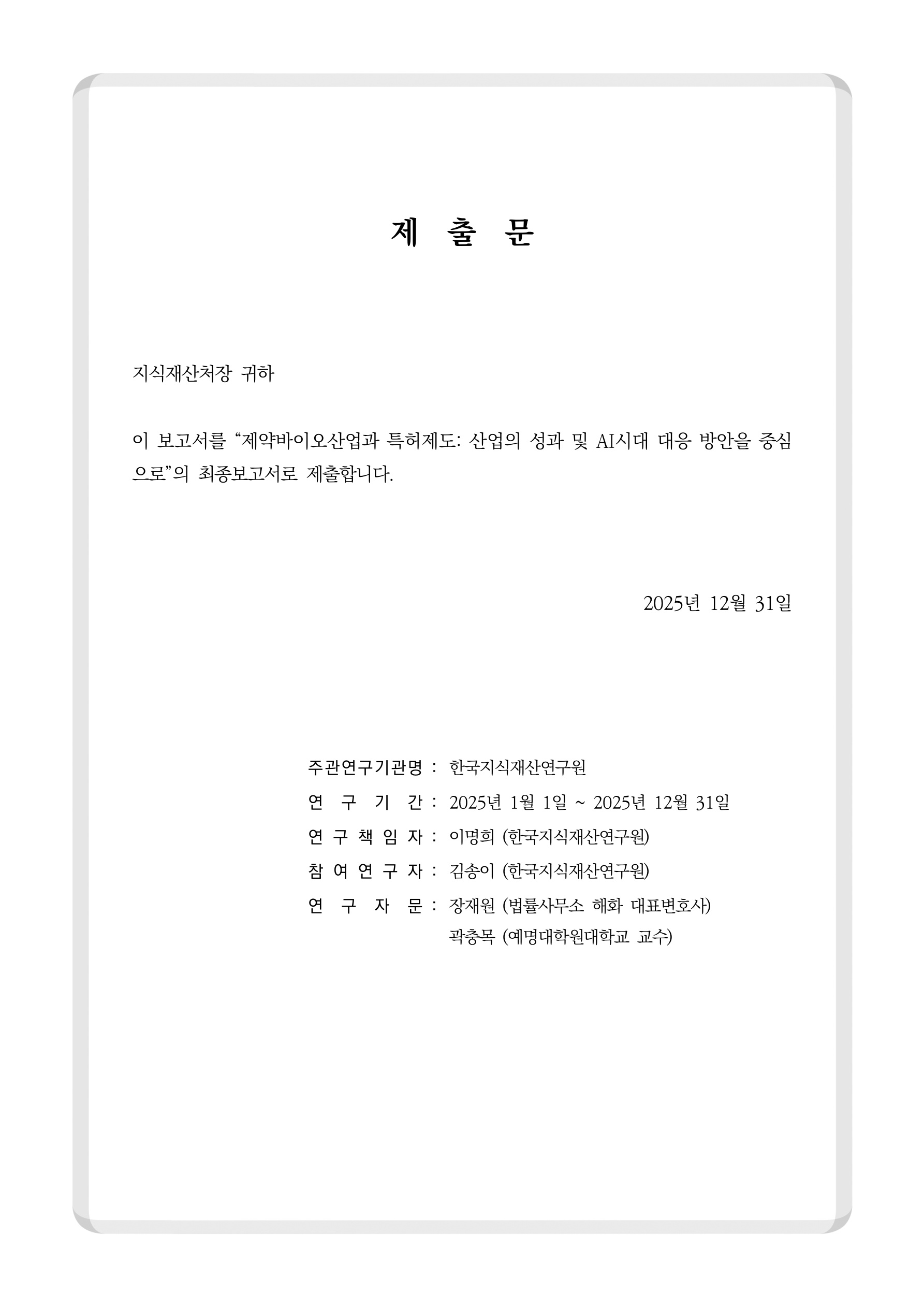 리더십학 전공 곽충목 교수님이 지식재산처(구 특허청) 법·제도 연구과제인 "제약바이오산업과 특허제도 : 산업의 성과 및 AI시대 대응 방안을 중심으로"에서 연구자문(주관연구기관: 한국지식재산연구원)으로 참여했습니다.